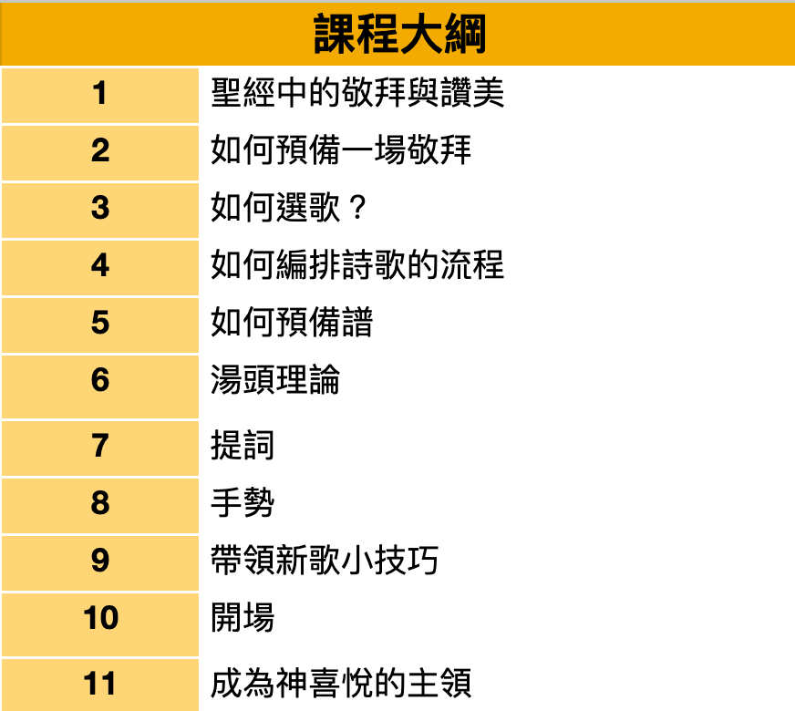 – 主領課 – 主領培訓班 (一) 由零開始,邁向成熟主領之路! *本課程無作業批改 透過課程的學習,預備你的主領服事吧! 課程適合誰? 預備投入主領服事主領服事一段時間,希望接受系統化的裝備 你能學會什麼? 主領服事正確的信仰觀念。主領服事的預備、編排、帶領等個環節的實務技巧。 “由聖經出發,靈命與實務雙管齊下,有系統的帶領你成為一位成熟的主領” 數十個國家的華人基督徒 正透過這個方式學習音樂敬拜 我們是 CWY敬拜學院,由台灣的音樂工作者與敬拜同工組成,致力透過線上課程,讓每一位基督徒只要願意,都能享受音樂敬拜的美好,學員遍佈數十個國家、上百間華人教會。 系統化的敬拜培訓課程 ✔ 針對敬拜實務需要,獨家設計的口訣與學習架構。✔由牧者、服事者共同討論開發,持續優化的學習內容。✔ 30 天內覺得不合適,同工為你調整方案或退費。 No Course Found 你好,歡迎回來! 保持登入 忘記密碼? 登入 還沒有帳號? 立即註冊 世智牧師 WWW敬拜事工共同創辦人中壢靈糧堂敬拜中心負責人靈糧神學院畢業,在中壢靈糧堂服事期間,建立視覺敬拜、助唱、主領、吉他、木箱鼓等相關培訓課程,2017年開始到中國、台灣各教會分享主領訓練至今。 現在就開始! *注意:本課程使用國際平台,受各國稅法影響,會另扣 6.5 % 的費用(商品稅+海外刷卡手續費用,實際費用依各國稅法變化), 如需其他付款方式,請聯繫官方Line@➜連結(人工報名,需1-2個工作天) NTD$ 2,490 主領培訓班 由零開始,邁向成熟主領之路! Popular [tutor_style_add_to_cart id="3520"]