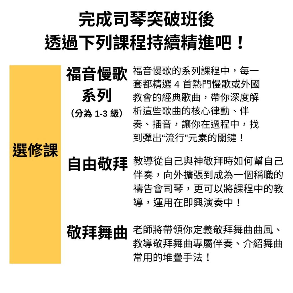 針對不同教會需要,開發的專項課程,例如自由敬拜、和弦編配、不同曲風的深度解析等內容,讓你不斷突破自我。